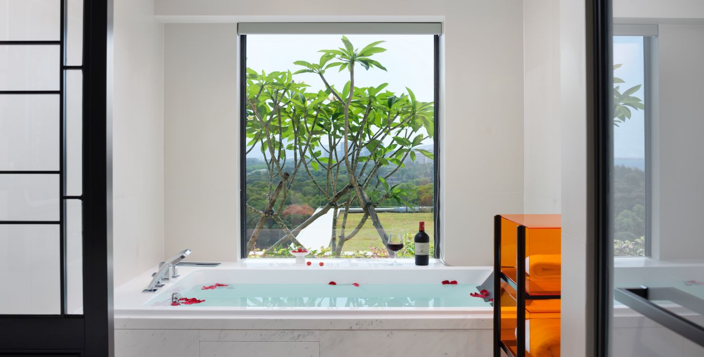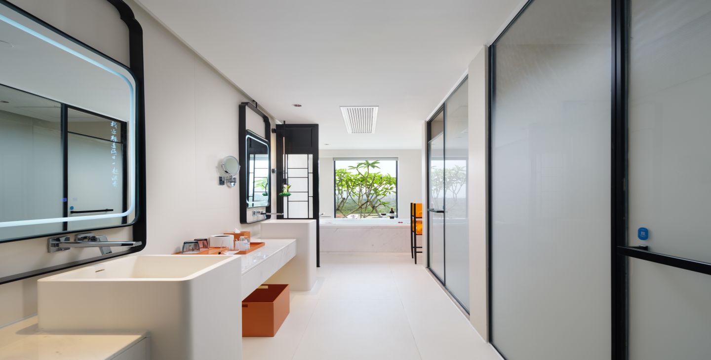 | 客房面积 | 80平米 | 客房特色 | 海景景观 / 270度观景面 / 榻榻米及卫生间落地窗景观效果 / 200寸巨幕投影 / 1.2米宽榻榻米(可提供免费铺床服务) / 步入式衣橱 | 床和床品 | 一张2米大床 / 厚被+薄被 / 泰国乳胶床垫 |