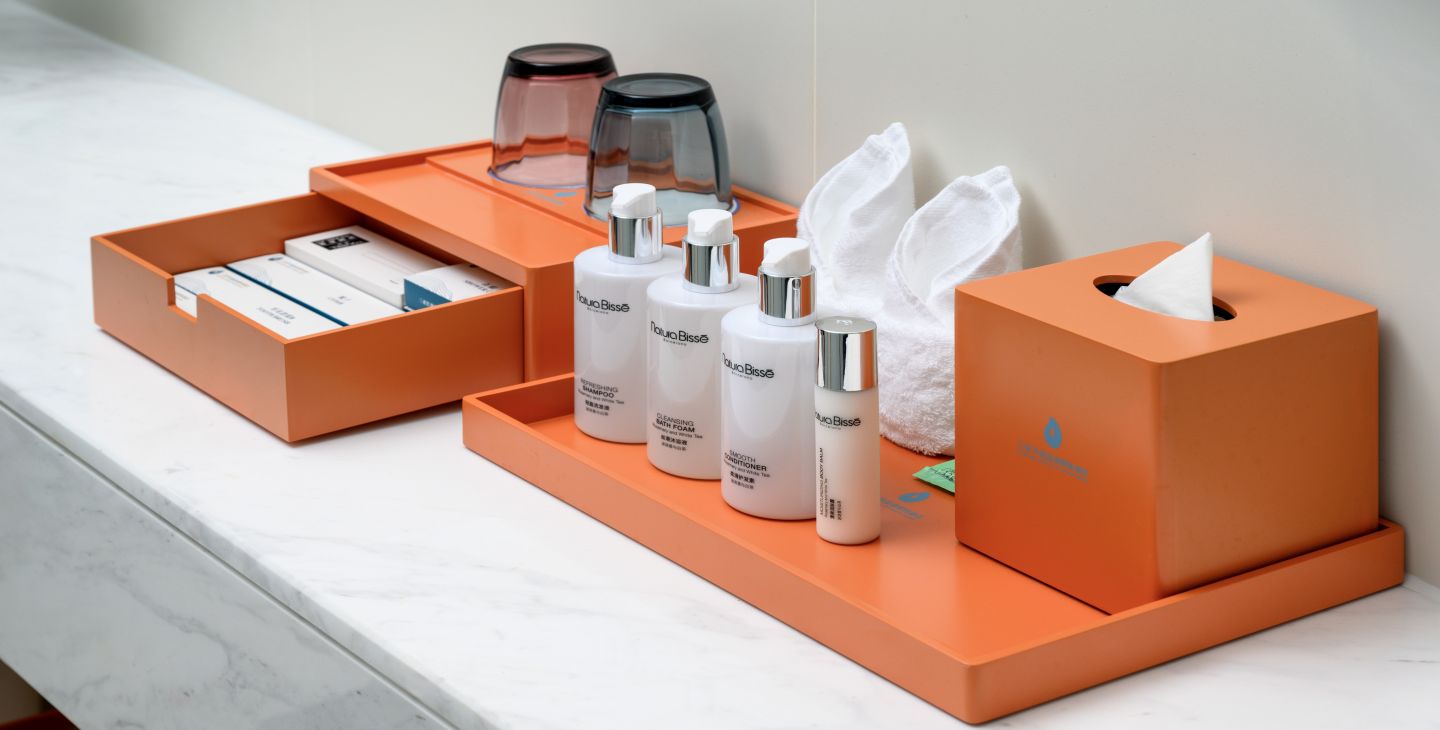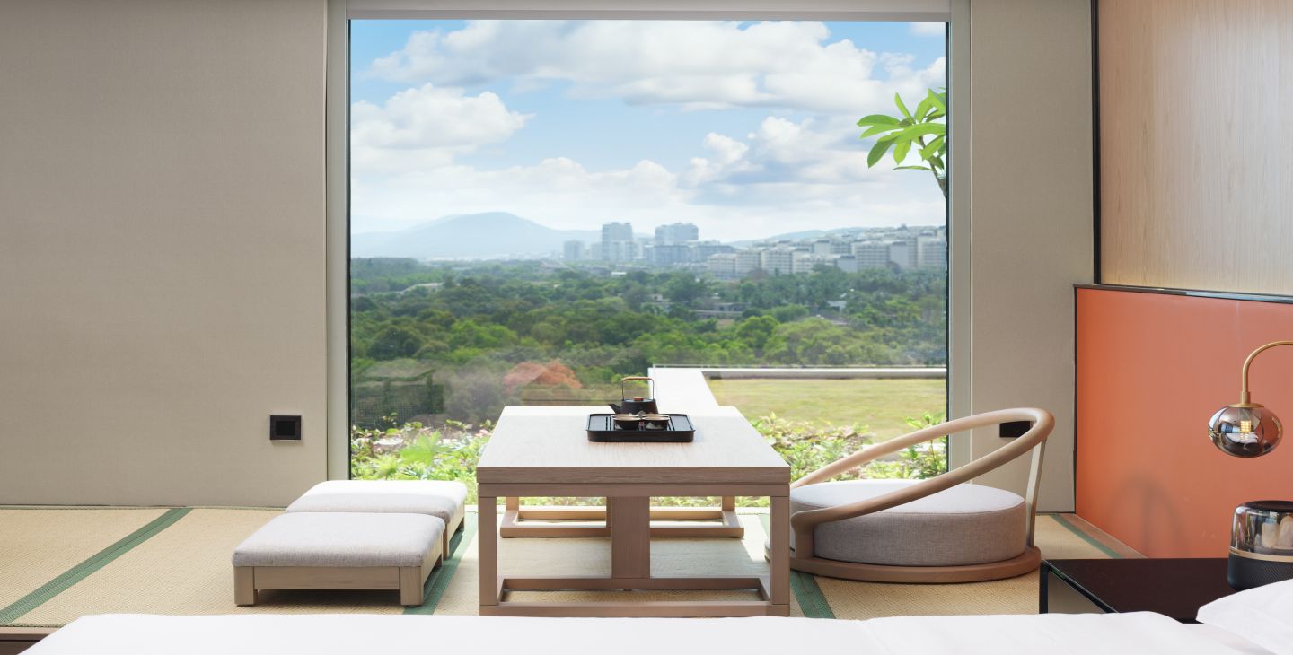 | 卫浴设施 | 双梳洗手台 / 独立浴间 / 双人浴缸 / 智能马桶 / 吹风机 / 浴袍 | 家具设施 | 榻榻米席坐 / 双人沙发 / 双椅 / 阳台圆床 / 观景高脚桌椅 / 手持式电熨斗 / 客房保险箱 / 晾衣架 | 餐饮设施 | MINI酒水吧 / 餐具 / 咖啡茶饮 / 功夫茶具 |
