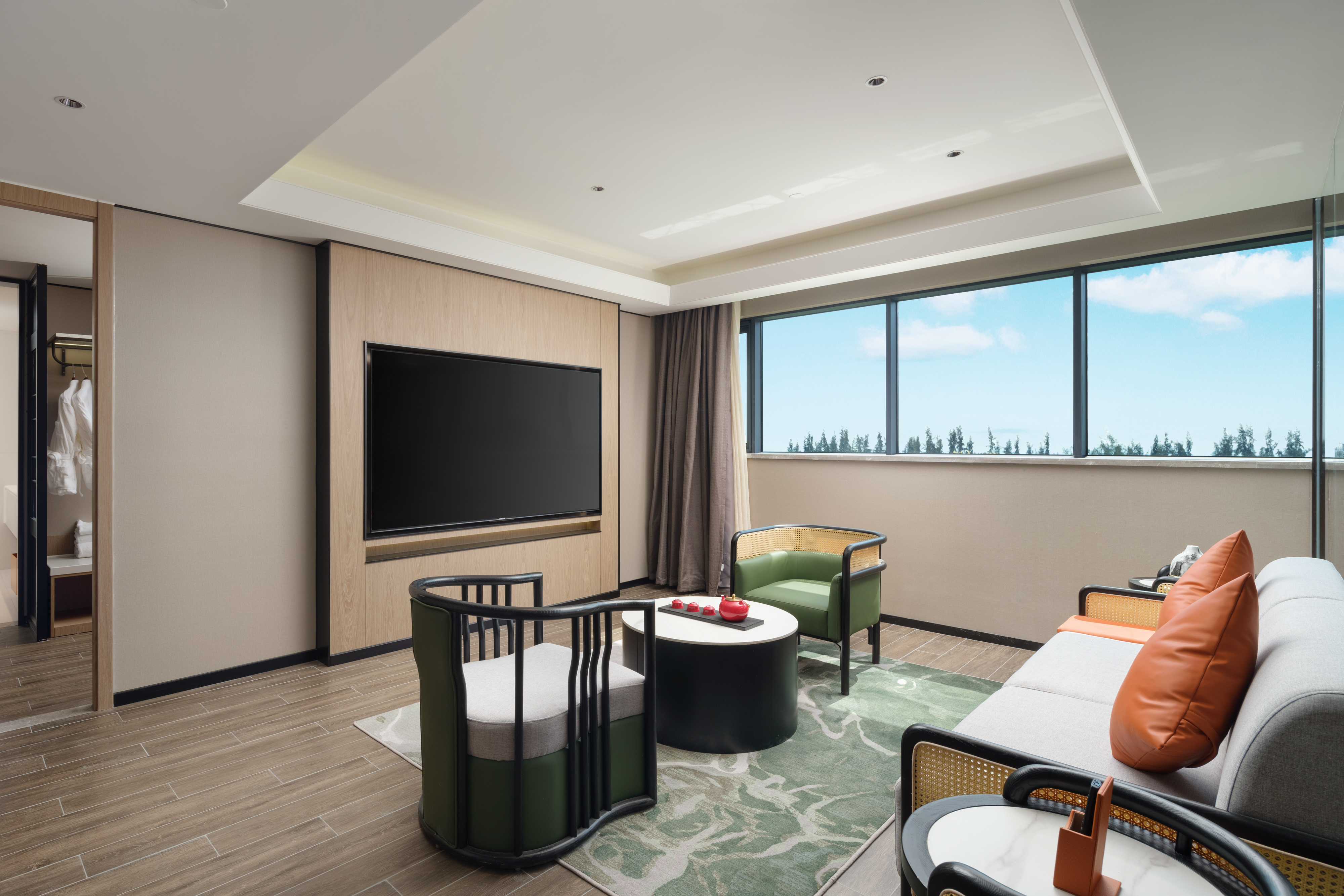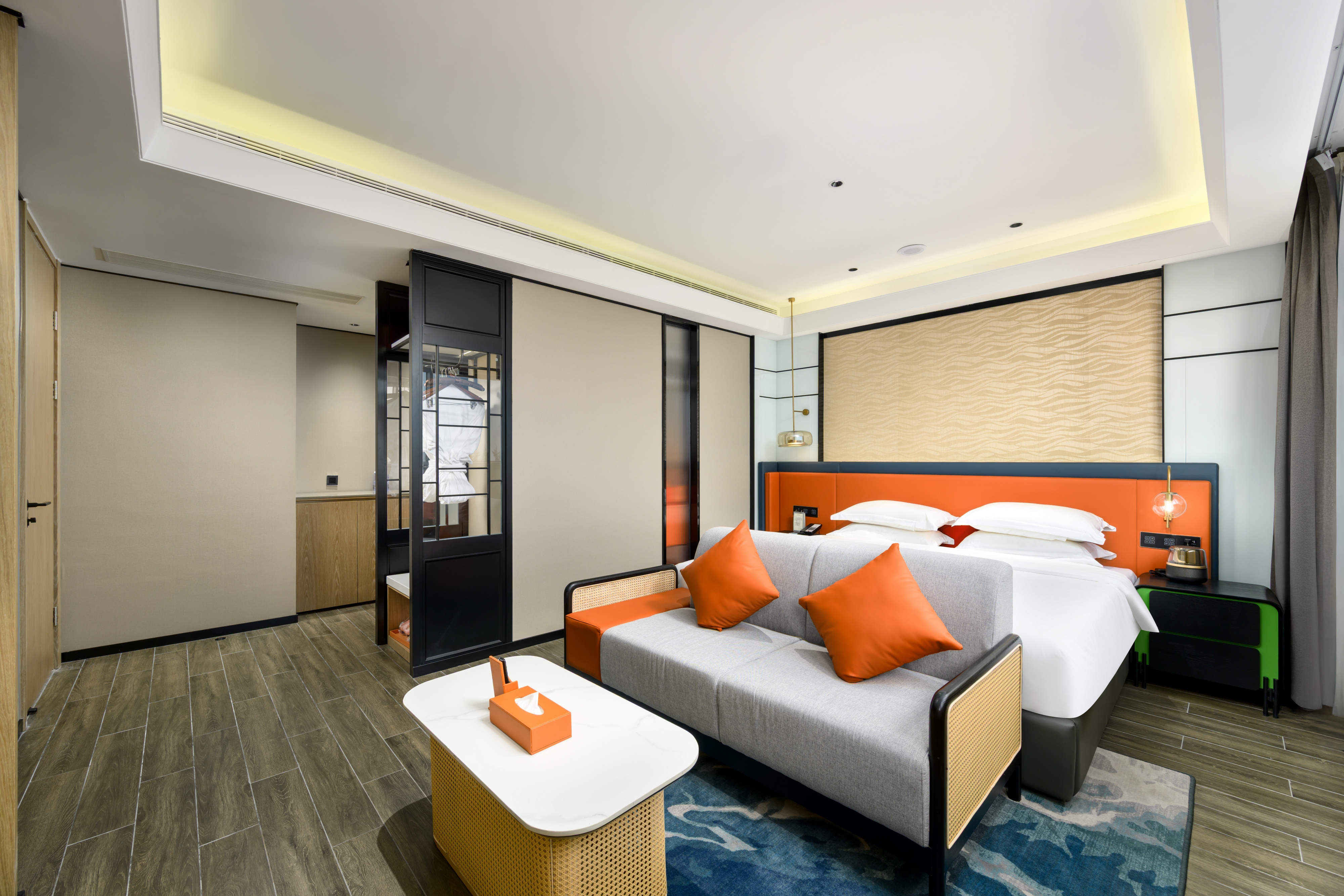 | 卫浴设施 | 独立卫浴/智能马桶/吹风机/浴袍 | 家具设施 | 组合沙发/休闲椅/手持式电熨斗/客房保险柜 | 餐饮设施 | MINI酒水吧/胶囊咖啡机/餐具/咖啡茶饮 |