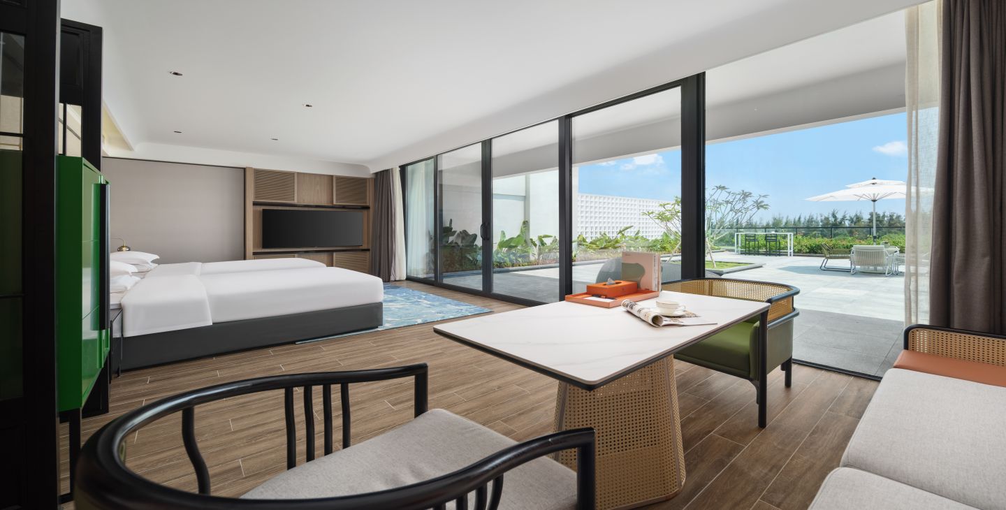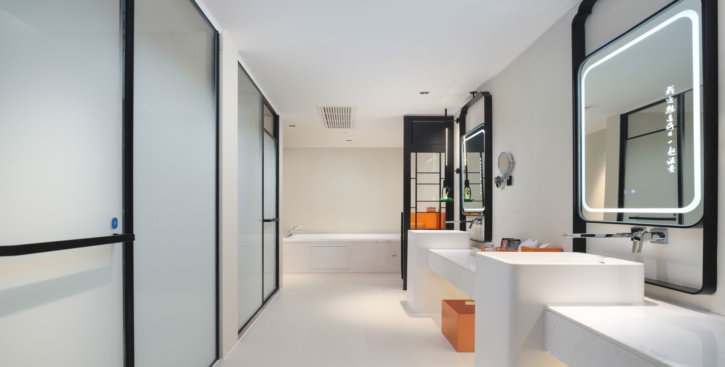 | 卫浴设施 | 双梳洗手台 / 独立浴间 / 双人浴缸 / 智能马桶 / 吹风机 / 浴袍 | 家具设施 | 双人沙发 / 双椅 / 手持式电熨斗 / 客房保险箱 / 晾衣架 | 餐饮设施 | MINI酒水吧 / 餐具 / 咖啡茶饮 / 功夫茶具 |