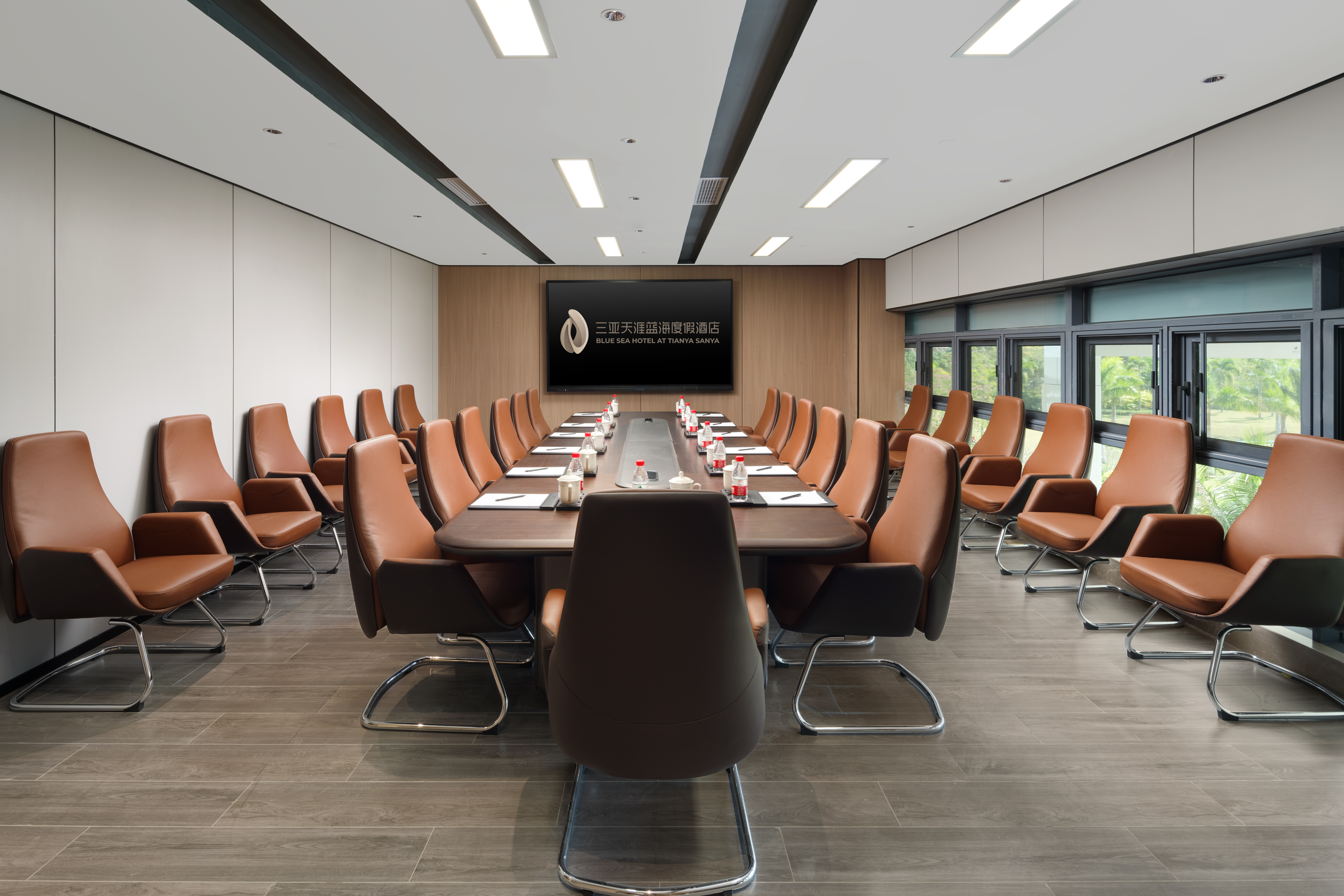 适用于各类中小型会议、学术报告、培训等活动的精致商务空间,可满足各种业务交流活动所需,配备100寸智能超大高清智慧手写显示屏,同时可满足高清视频会议等要求。